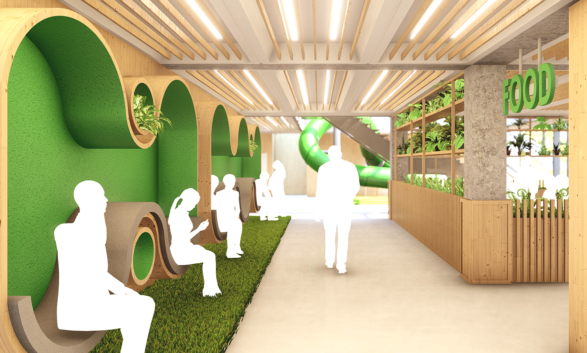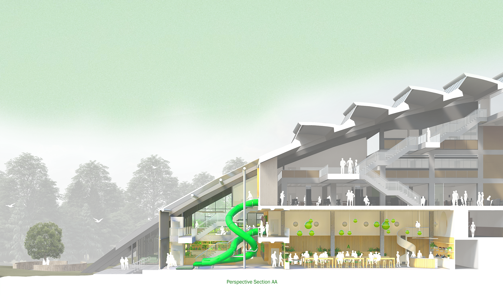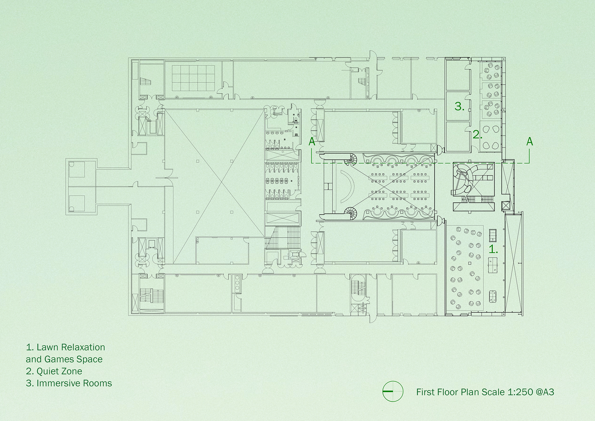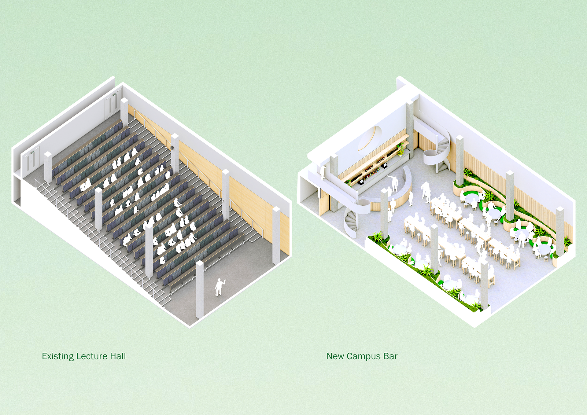 ‘De-Stress at ABS’ is an entry for the RGU Campus Development Competition 2021. - Awarded ‘Best in the Category: Lecture Theatres and Tiered Spaces’ and also, ‘Best Overall Design’ A study found that 8 out of 10 university students in the UK reported stress and/or anxiety during their studies. Long term stress increases the risk of mental and physical health problems. We believe universities should incorporate more places on campus to take time away and de-stress. De-Stress at ABS is a proposal for a new bar, food and social space designed as an escape from the stresses of university, located in the Aberdeen Business School at the heart of the Robert Gordon University campus. Walls and boundaries come down as the enclosed existing tiered lecture hall transforms into a new campus bar and opens to the landscape allowing light to fill the two levels. A playful new slide sets the tone for the intervention which can be seen from all around. Curving rounded forms which set the space apart from the existing rigid high-tech building lift the mood and softens the experience. Both social interaction and personal space are important – whether you want to take time alone in the quiet zone or spend time with your friends in the bar, there is a place for how you want to de-stress. Acknowledged stress-relieving activities moulded the design with the proposal facilitating resting, music, games, a calm environment for creativity, meditation, comfort through natural and soft textured materials, eating healthy in the food space, interactivity whether it is with the lawn space or the immersive rooms, encouragement to go out and get moving, exploring the green campus. Long sightlines, daylight, and high ceilings act as a soothing mechanism for the users. The landscape around the building has been transformed to make use of the existing lawns to create new social spaces which could be brought to life year-round due to the re-use of the south end of the school.