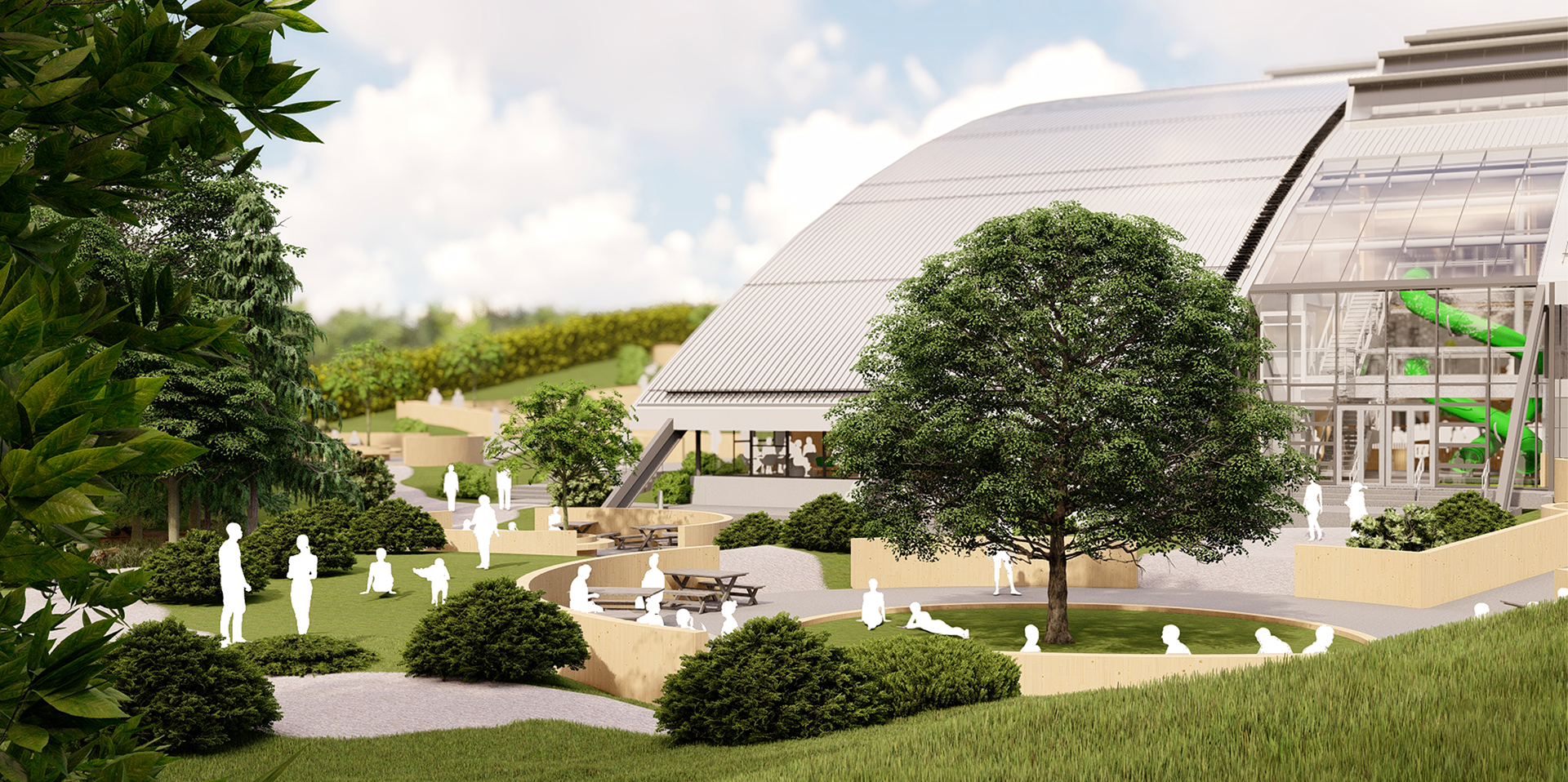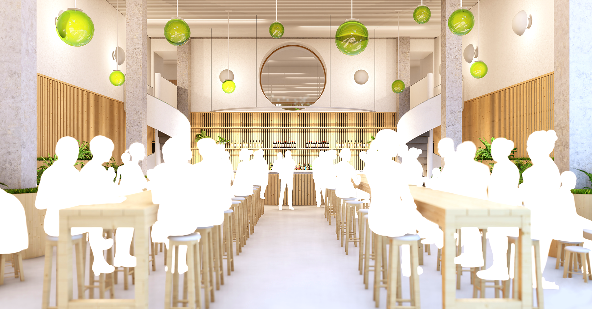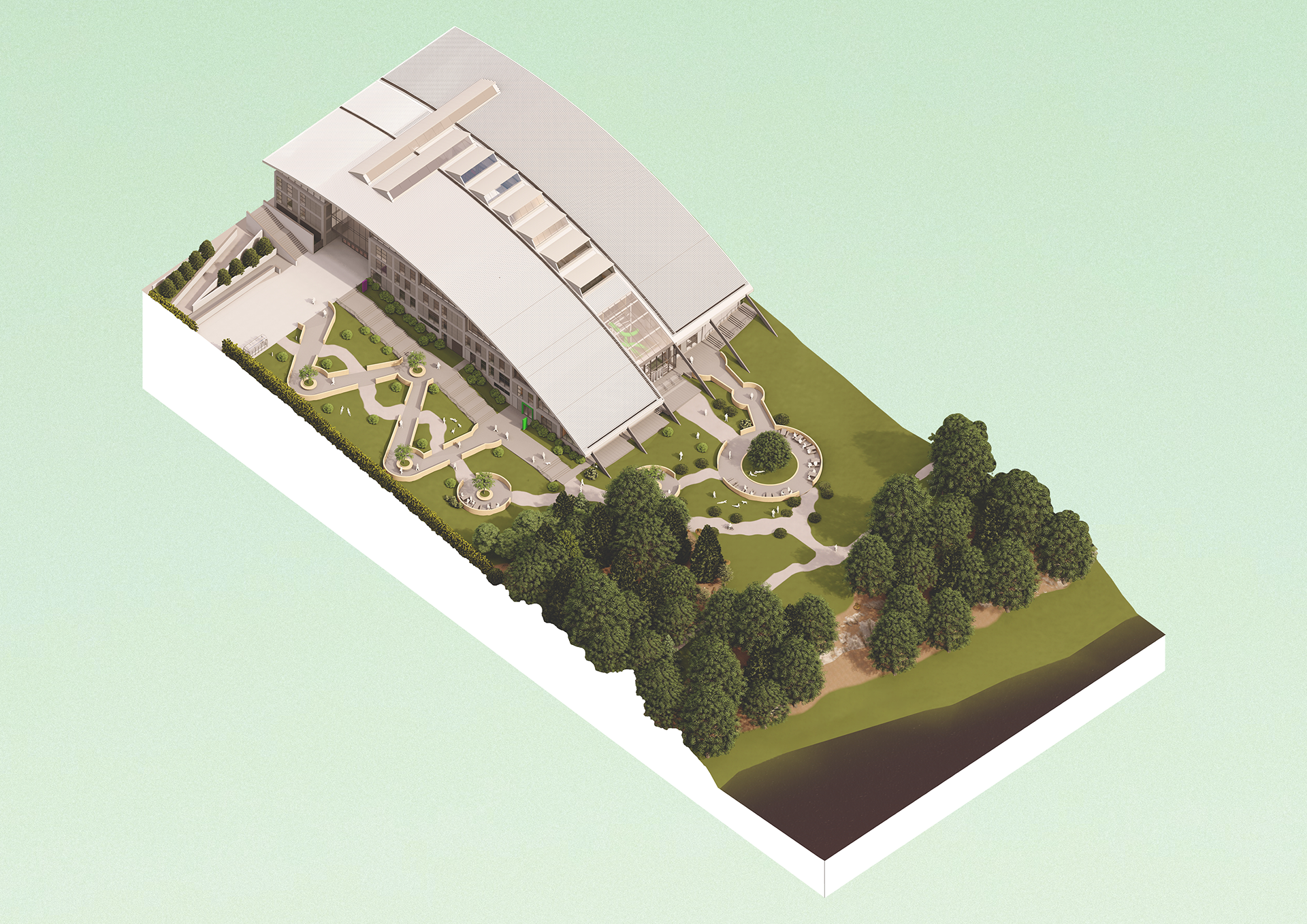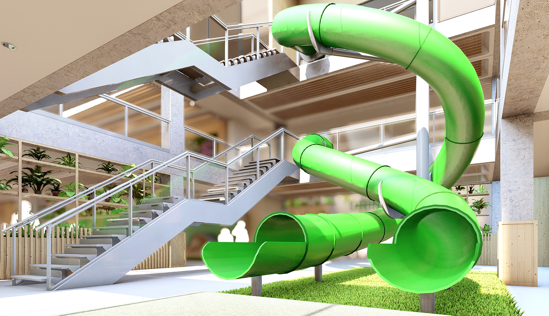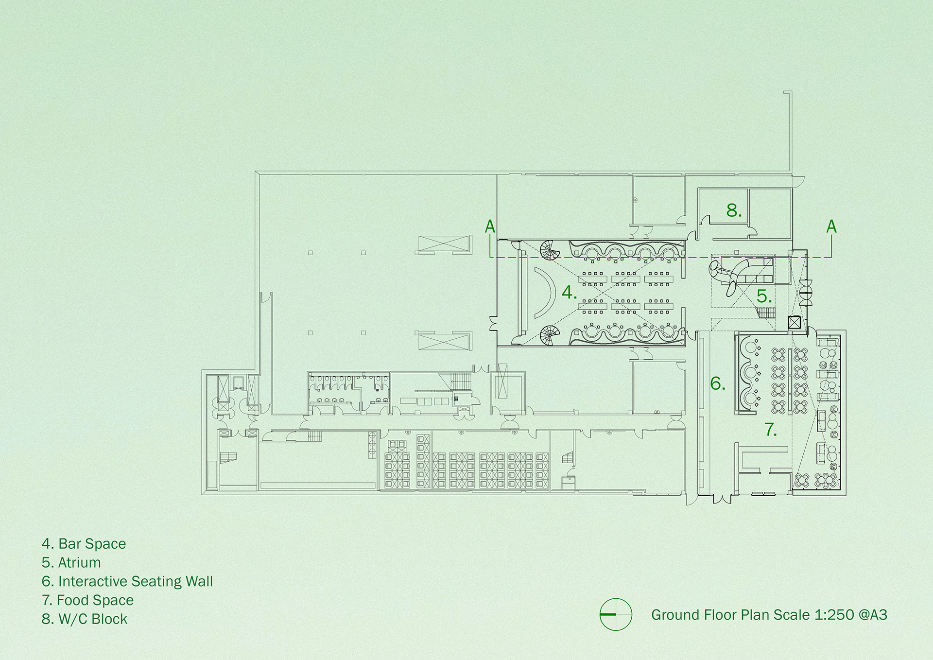 ‘De-Stress at ABS’ is an entry for the RGU Campus Development Competition 2021. - Awarded ‘Best in the Category: Lecture Theatres and Tiered Spaces’ and also, ‘Best Overall Design’ A study found that 8 out of 10 university students in the UK reported stress and/or anxiety during their studies. Long term stress increases the risk of mental and physical health problems. We believe universities should incorporate more places on campus to take time away and de-stress. De-Stress at ABS is a proposal for a new bar, food and social space designed as an escape from the stresses of university, located in the Aberdeen Business School at the heart of the Robert Gordon University campus. Walls and boundaries come down as the enclosed existing tiered lecture hall transforms into a new campus bar and opens to the landscape allowing light to fill the two levels. A playful new slide sets the tone for the intervention which can be seen from all around. Curving rounded forms which set the space apart from the existing rigid high-tech building lift the mood and softens the experience. Both social interaction and personal space are important – whether you want to take time alone in the quiet zone or spend time with your friends in the bar, there is a place for how you want to de-stress. Acknowledged stress-relieving activities moulded the design with the proposal facilitating resting, music, games, a calm environment for creativity, meditation, comfort through natural and soft textured materials, eating healthy in the food space, interactivity whether it is with the lawn space or the immersive rooms, encouragement to go out and get moving, exploring the green campus. Long sightlines, daylight, and high ceilings act as a soothing mechanism for the users. The landscape around the building has been transformed to make use of the existing lawns to create new social spaces which could be brought to life year-round due to the re-use of the south end of the school.