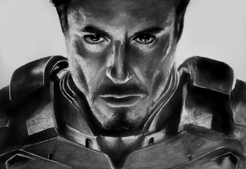 This portrait of Iron Man was produced using graphite and charcoal.