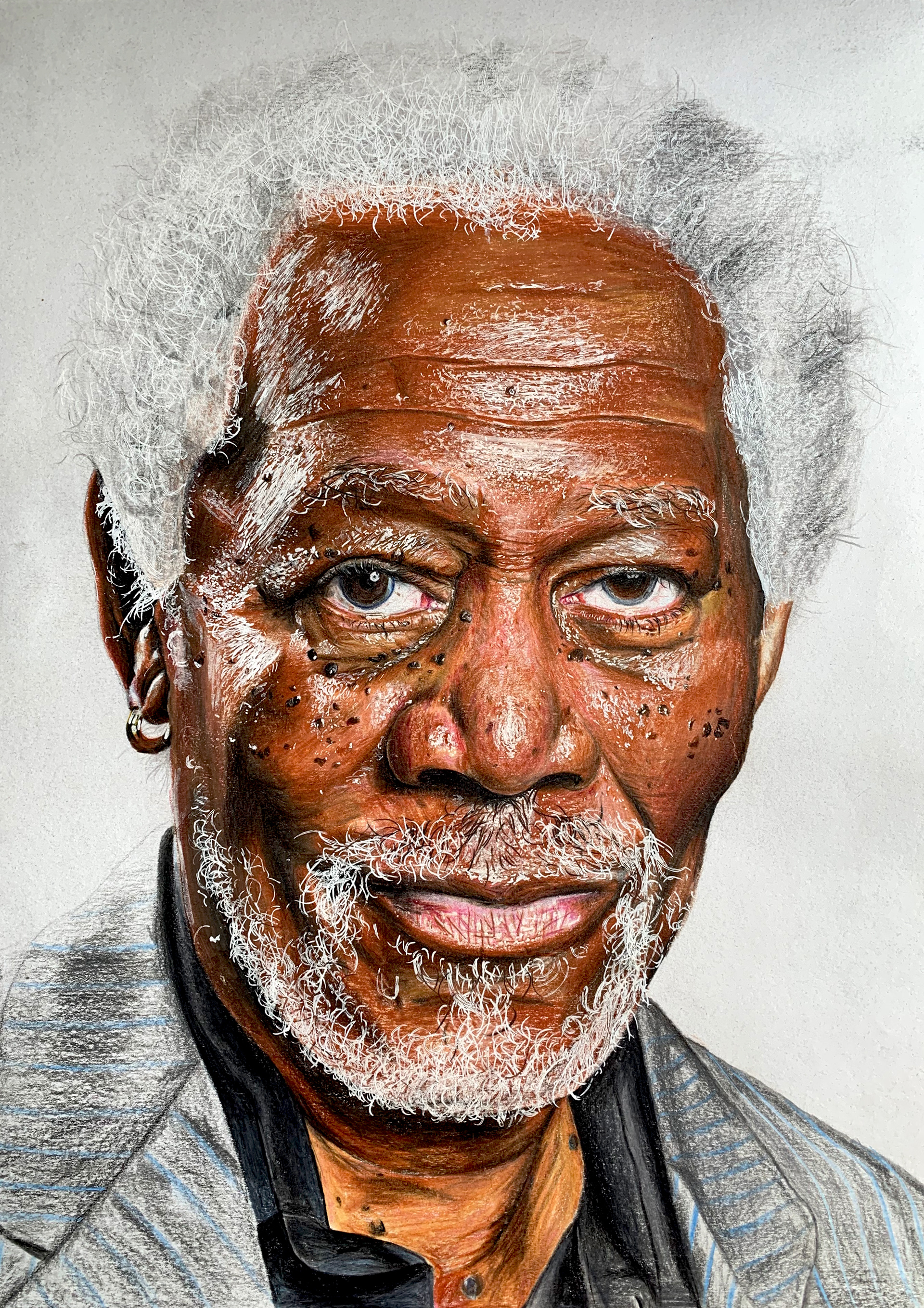 "Portrait of Morgan Freeman". Coloured pencil on paper (420 x 297mm) Produced in 17 hours.