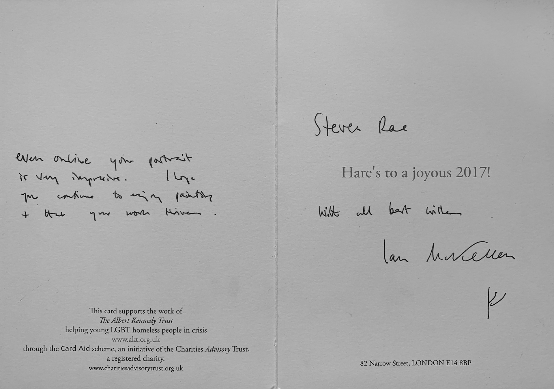 The card reads "even online your portrait is very impressive. I hope you continue to enjoy painting + that your work thrives."